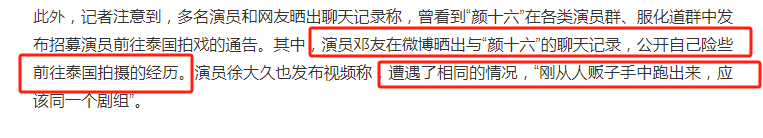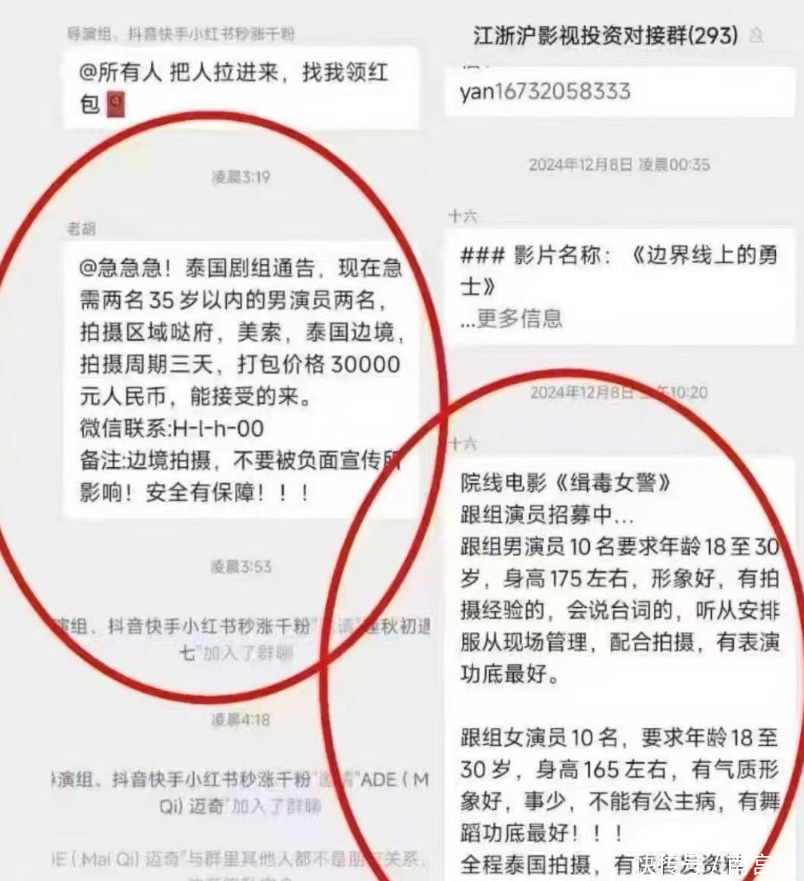 不仅如斯,有东谈主发现何俊旻和王星疑似是被合并个东谈主诱拐了东南亚,何俊旻口口声声说我方是去泰国拍摄《缉毒女警》,那时在群内招募演员的是一个名为颜十六的东谈主,他之前在群里的身份是演员统筹,那时颜十六在多个大组群里发布了纰谬招聘,并条款对方必须有护照,拍摄全程齐在泰国进行。