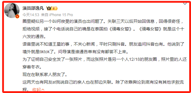 演员王星吉利获救!可又一个叫何俊旻的演员去泰国拍摄《缉毒女警》疑似被欺压了,王星也被骗去了合并个剧组,如今满宇宙的东谈主齐在找何俊旻,还有同是演员的邵艺凡更为其发声,但愿有才气的东谈主简略帮帮何俊旻。