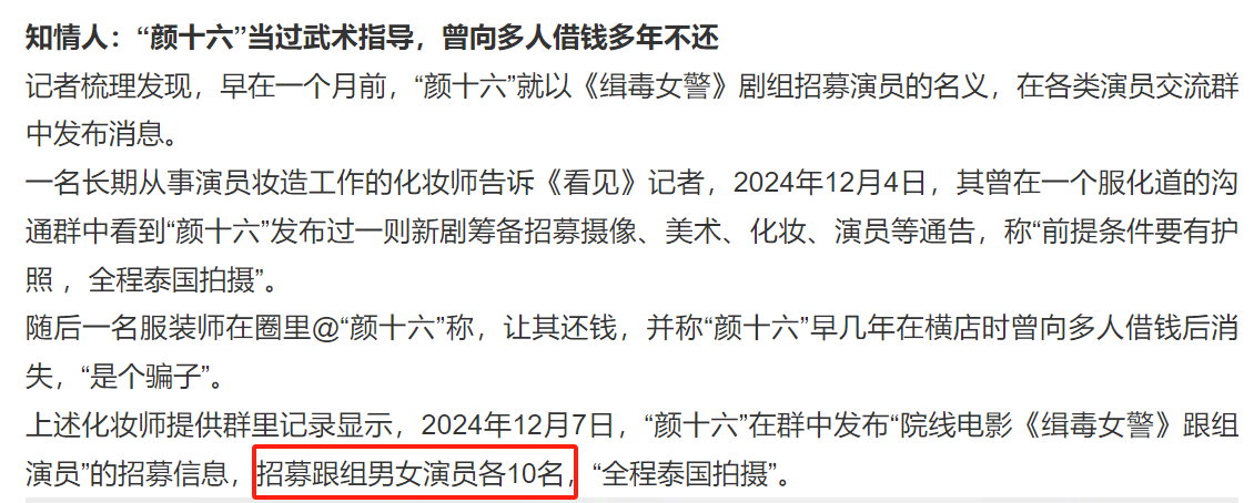 话又说讲究,这位诱拐了王星和何俊旻的中介颜十六被曝也曾刊出了我方的外交平台账号,而他本东谈主也被控诉借债不还,但到底他是否和园区有干系,或者擅自运输了东谈主口,这些内幕细节暂未可知。